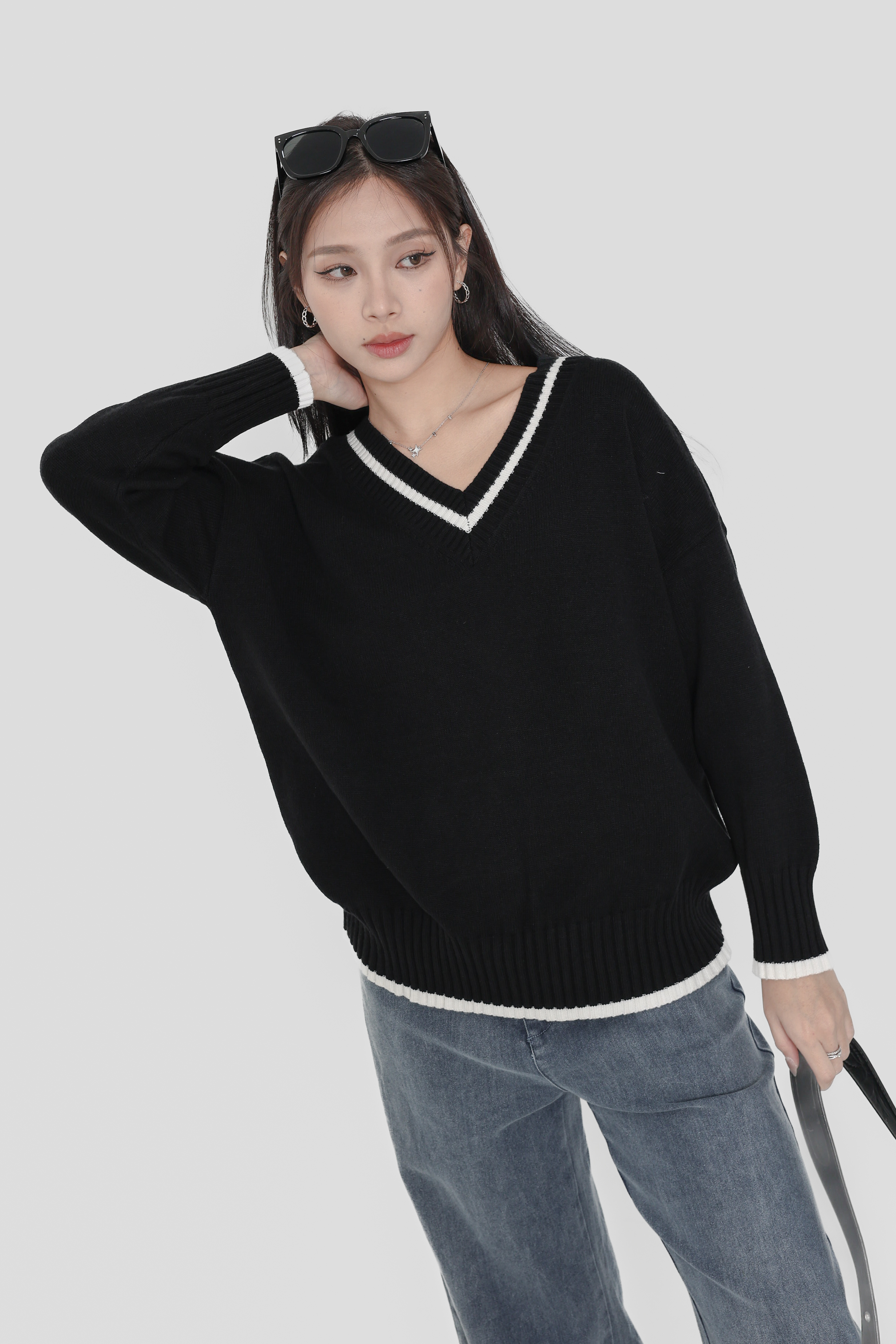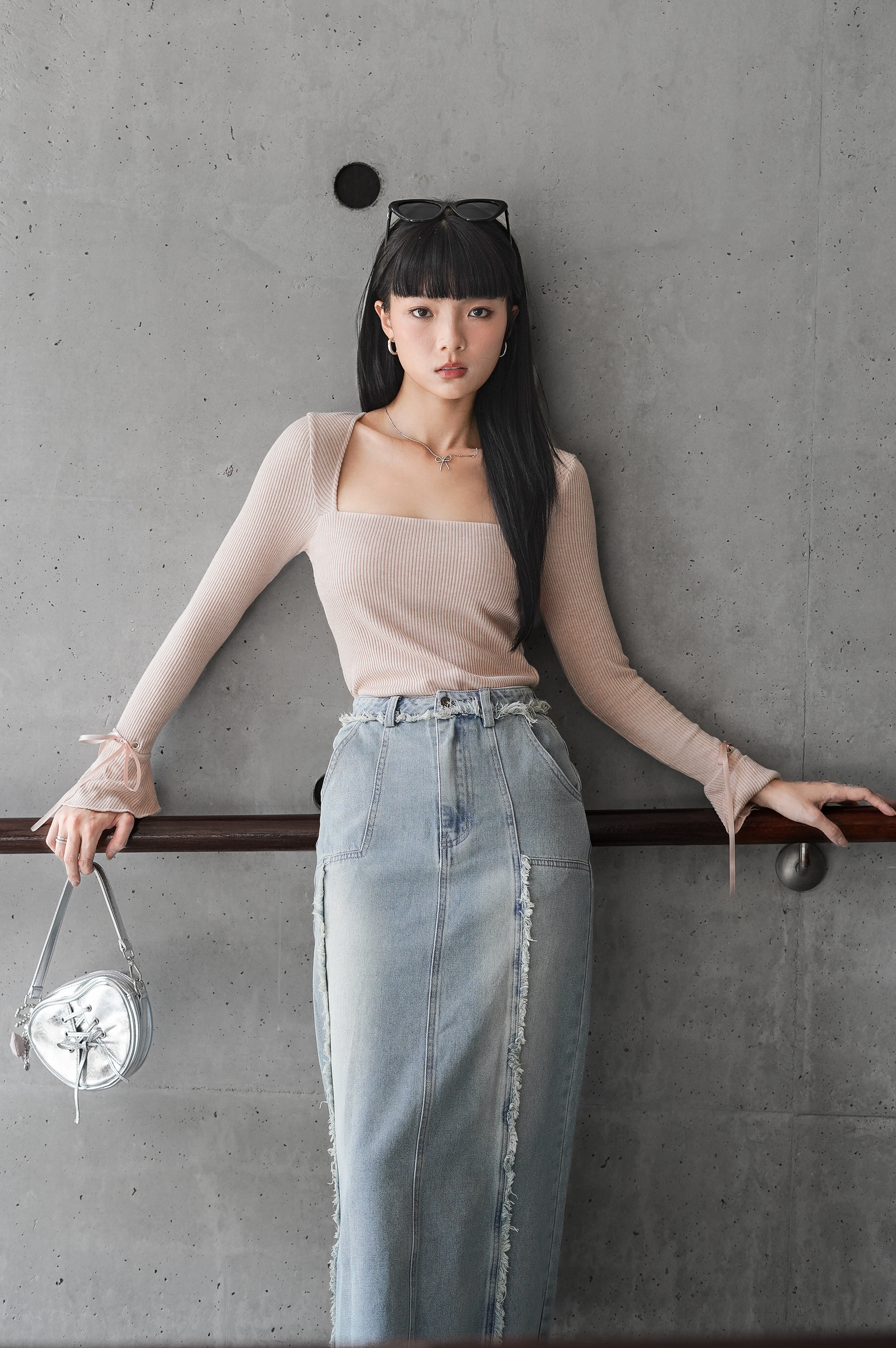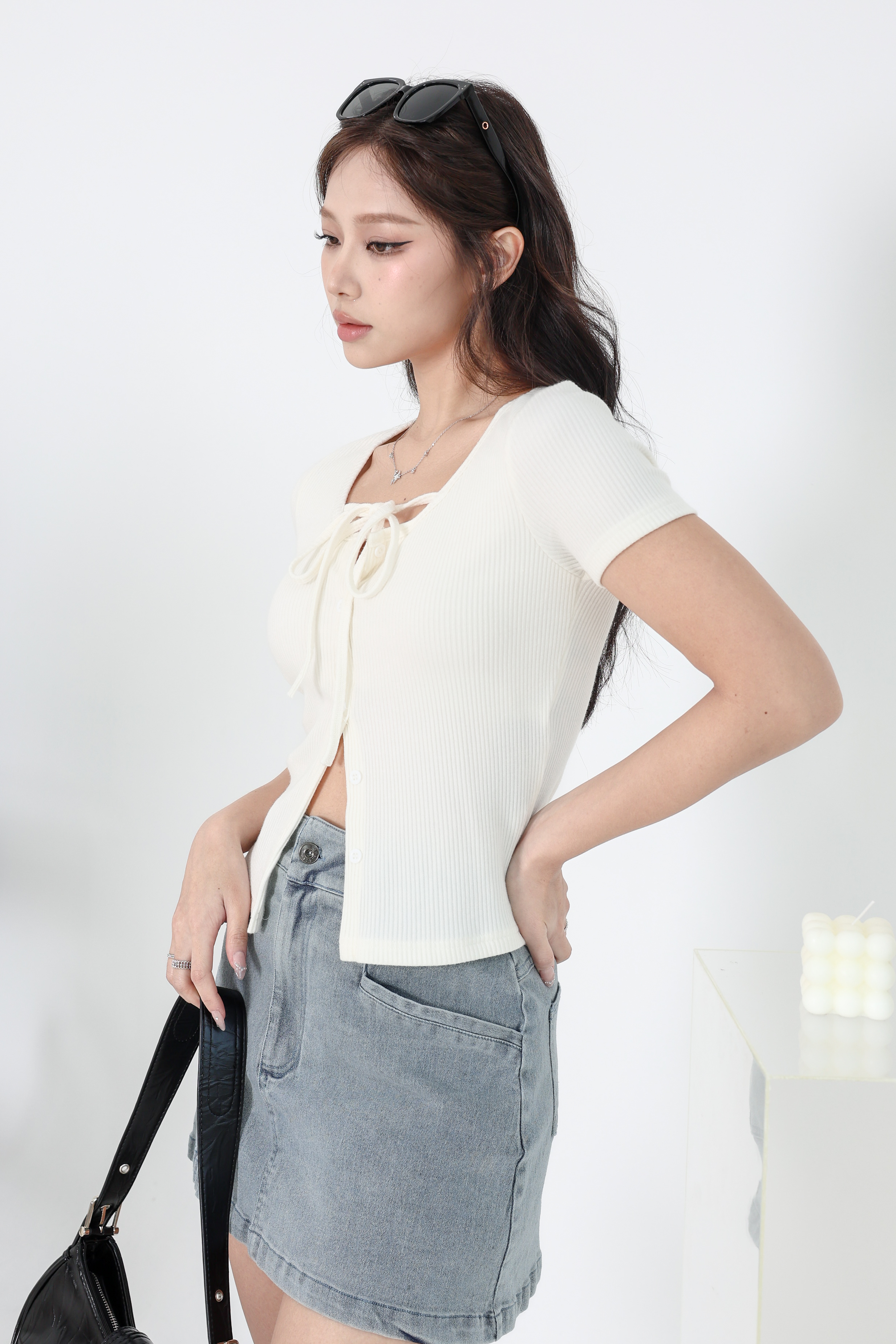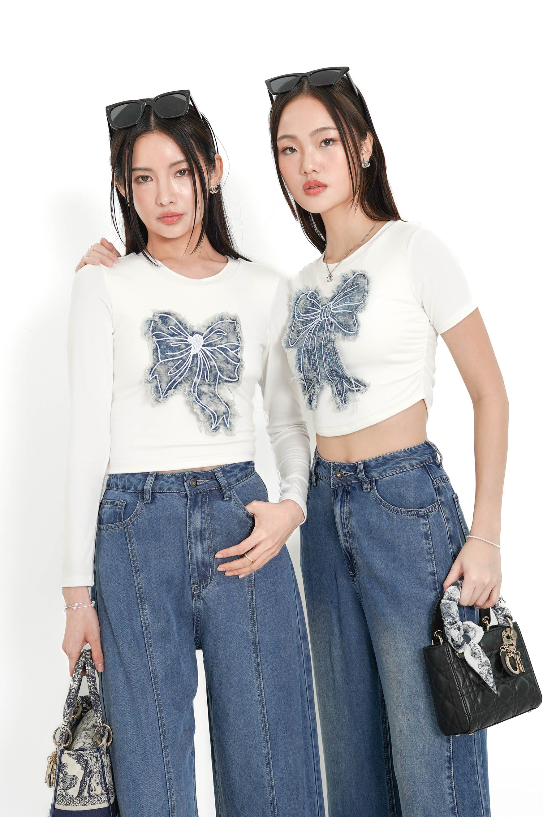 *TPZ* PERFECT BASIC LONG SLEEVES TOP WITH EMBROIDERY DENIM RIBBON IN WHITE