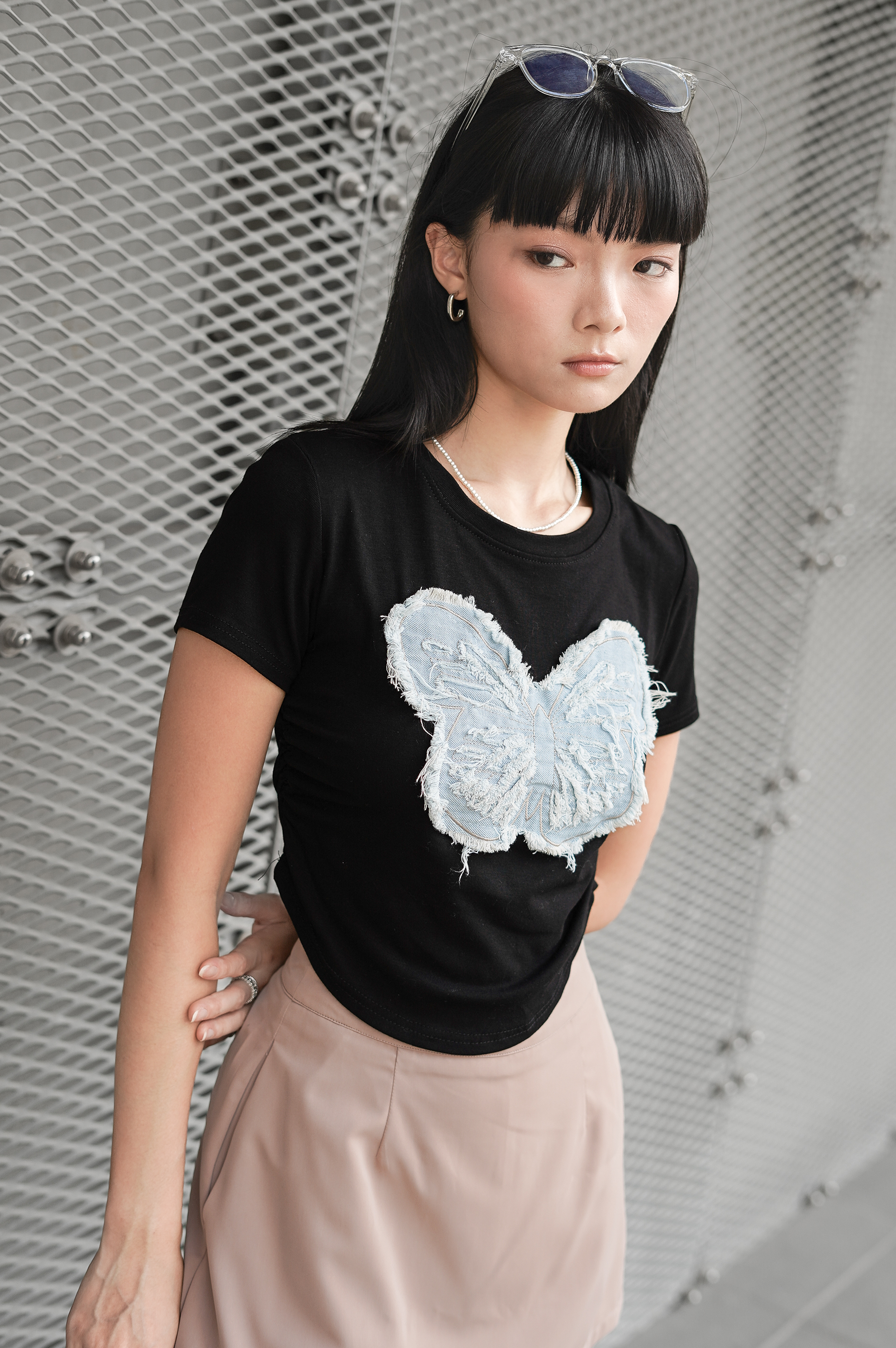 *K-SPECIAL* FRAYED DENIM BUTTERFLY RUCHED TOP