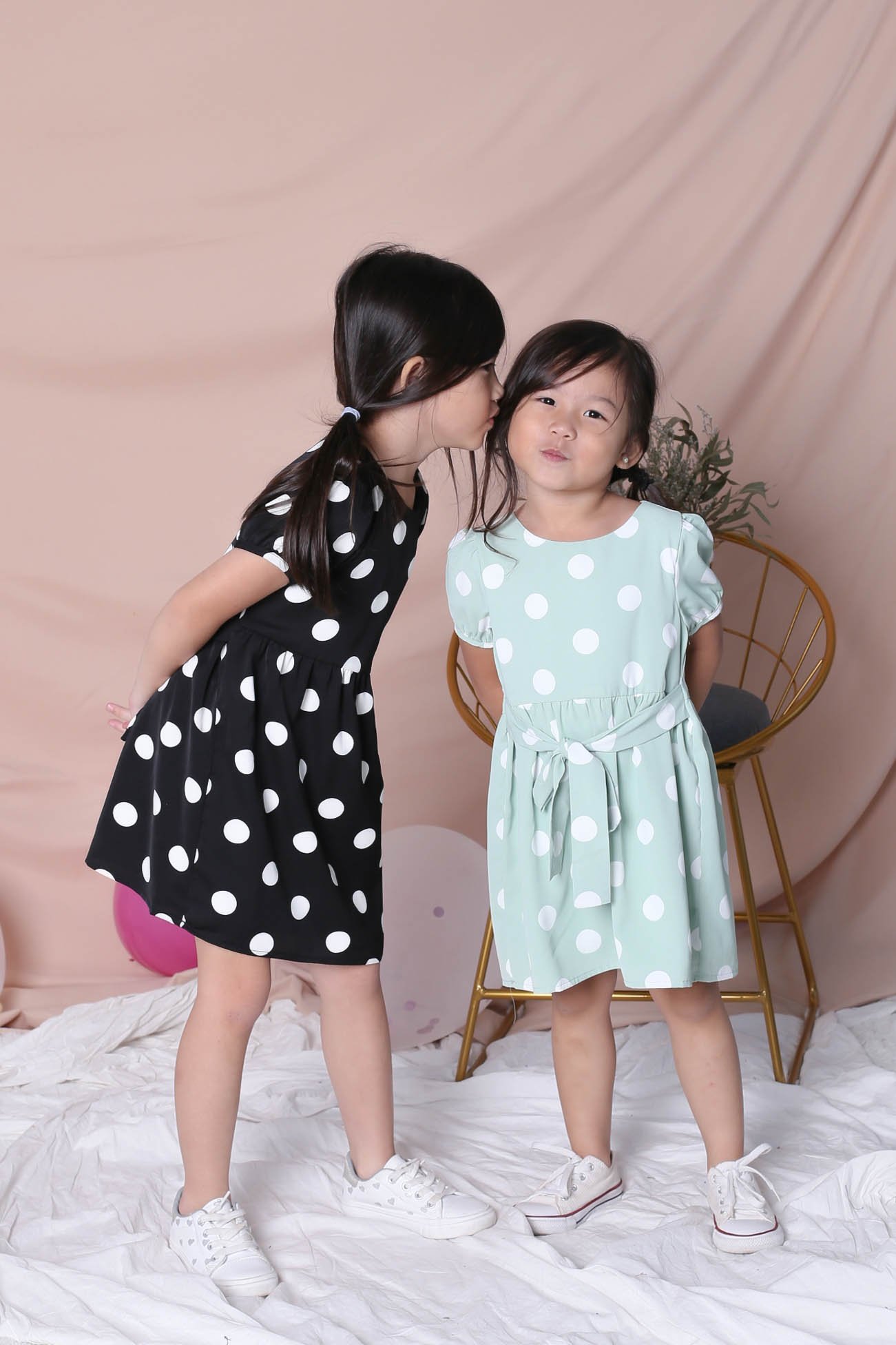 *LITTLE TOPAZETTE* POLKA DOT SLEEVE TIE DRESS IN BLACK