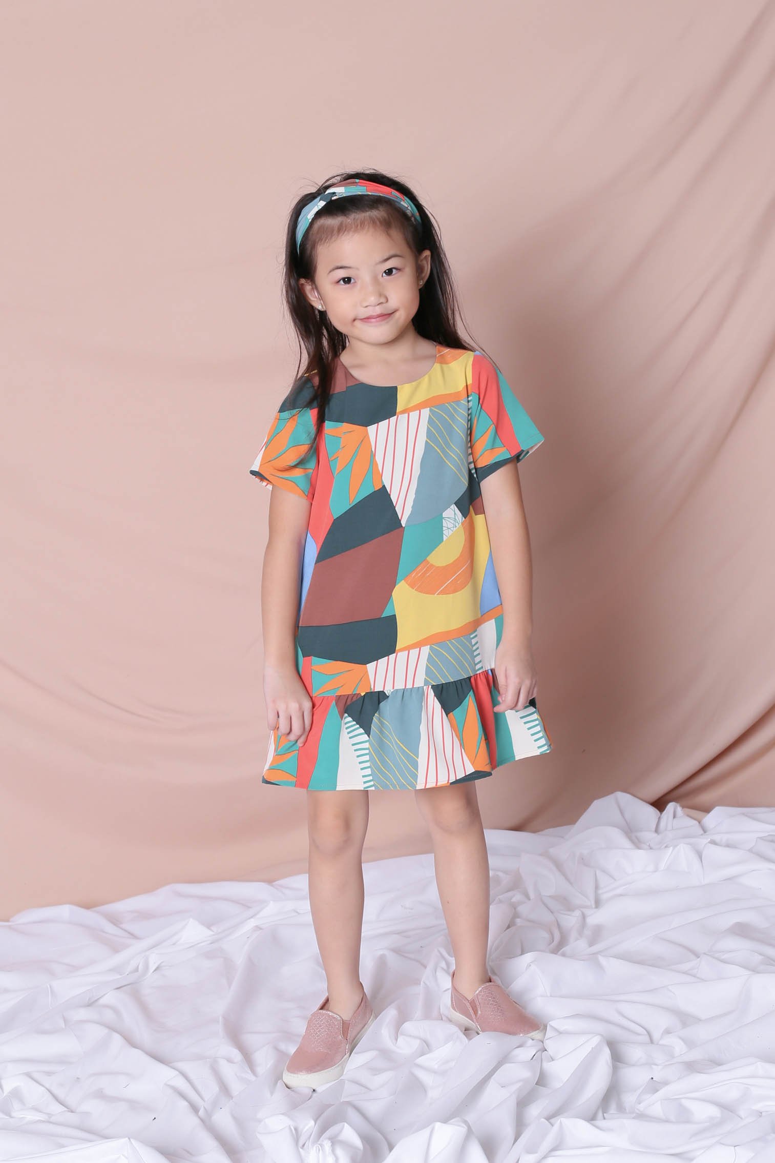 *LITTLE TOPAZETTE* THE COLOURFUL ABSTRACT DROP WAIST DRESS (VERSION 2) GREEN/ BROWN