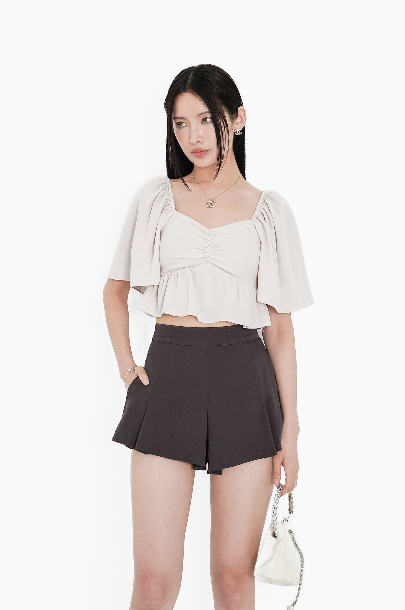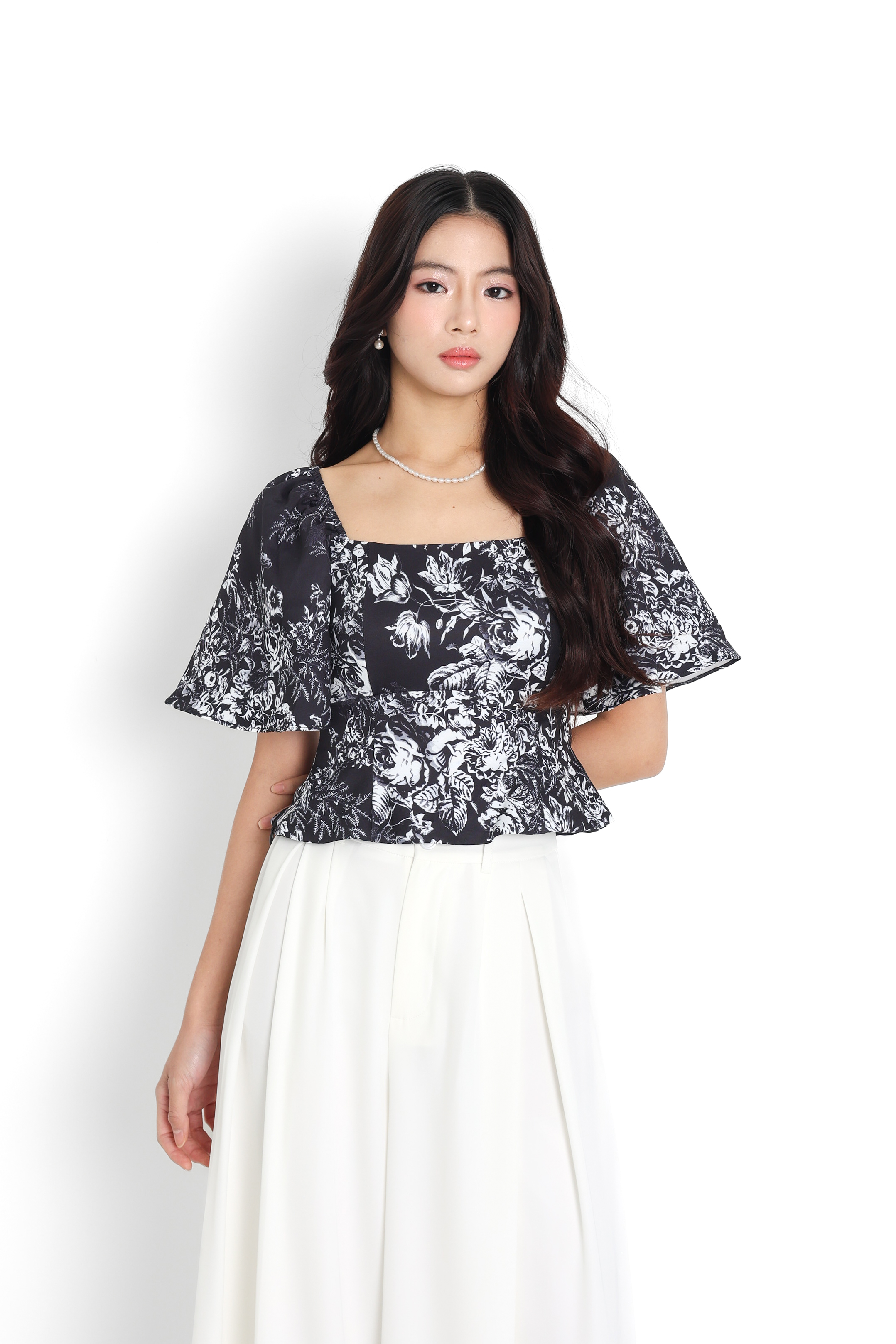 *TPZ* TRINITY PEPLUM FLUTTER SLEEVES TOP IN IVORY PEARL