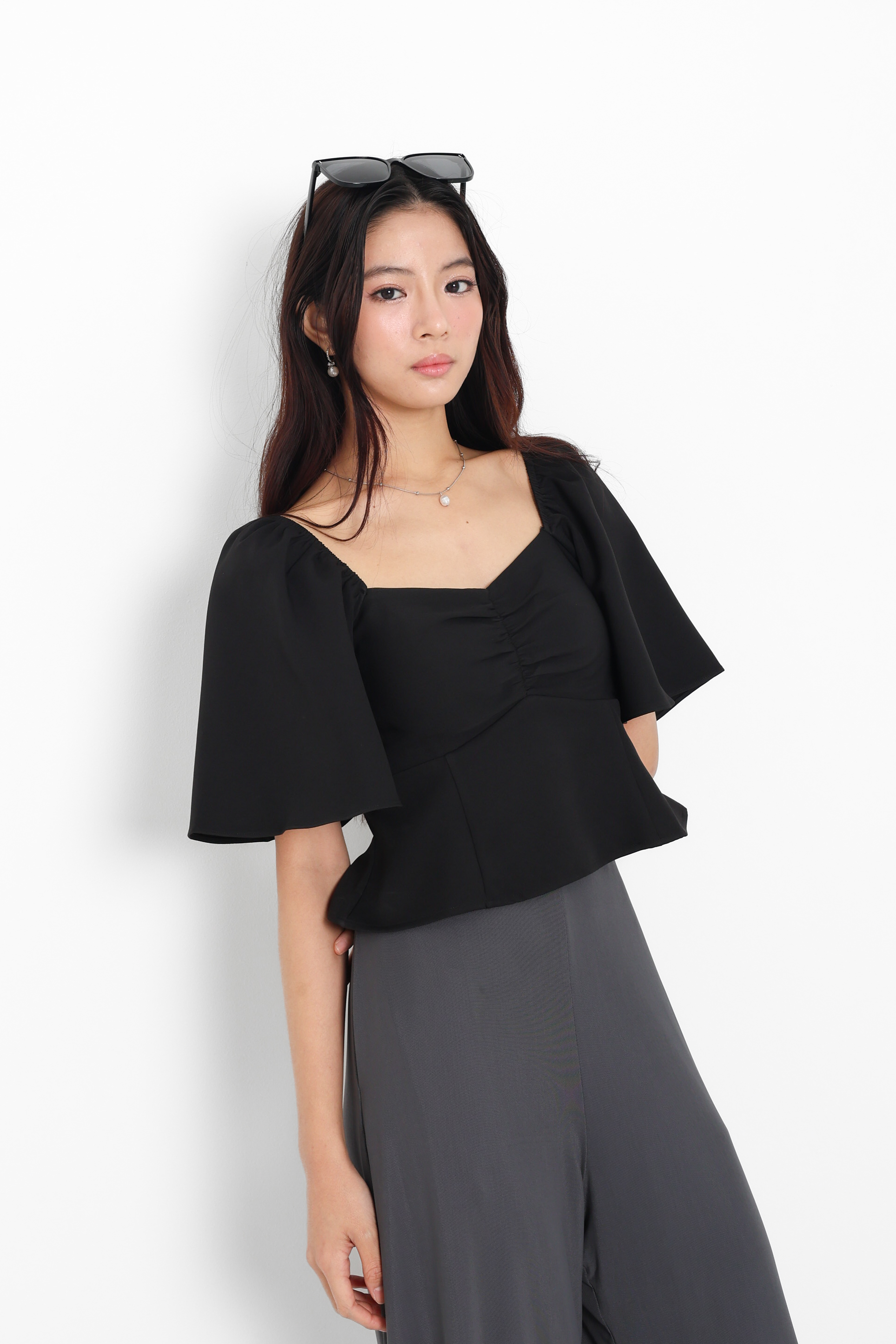 *TPZ* TRINITY PEPLUM FLUTTER SLEEVES TOP IN BLACK