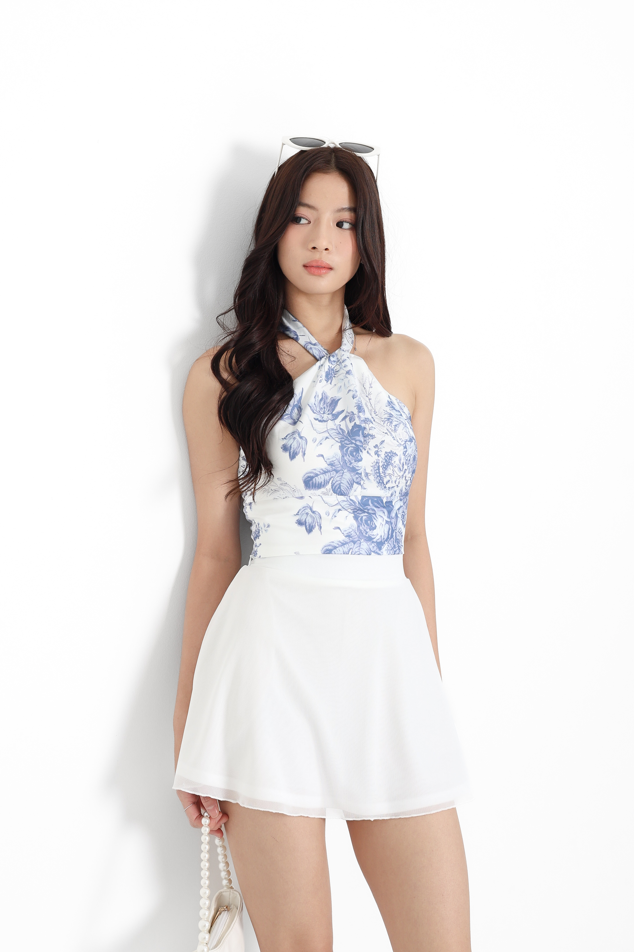 *TPZ* ASTER HALTER RIBBON TOP IN TOILE DE FORTUNE FROSTED BLUE